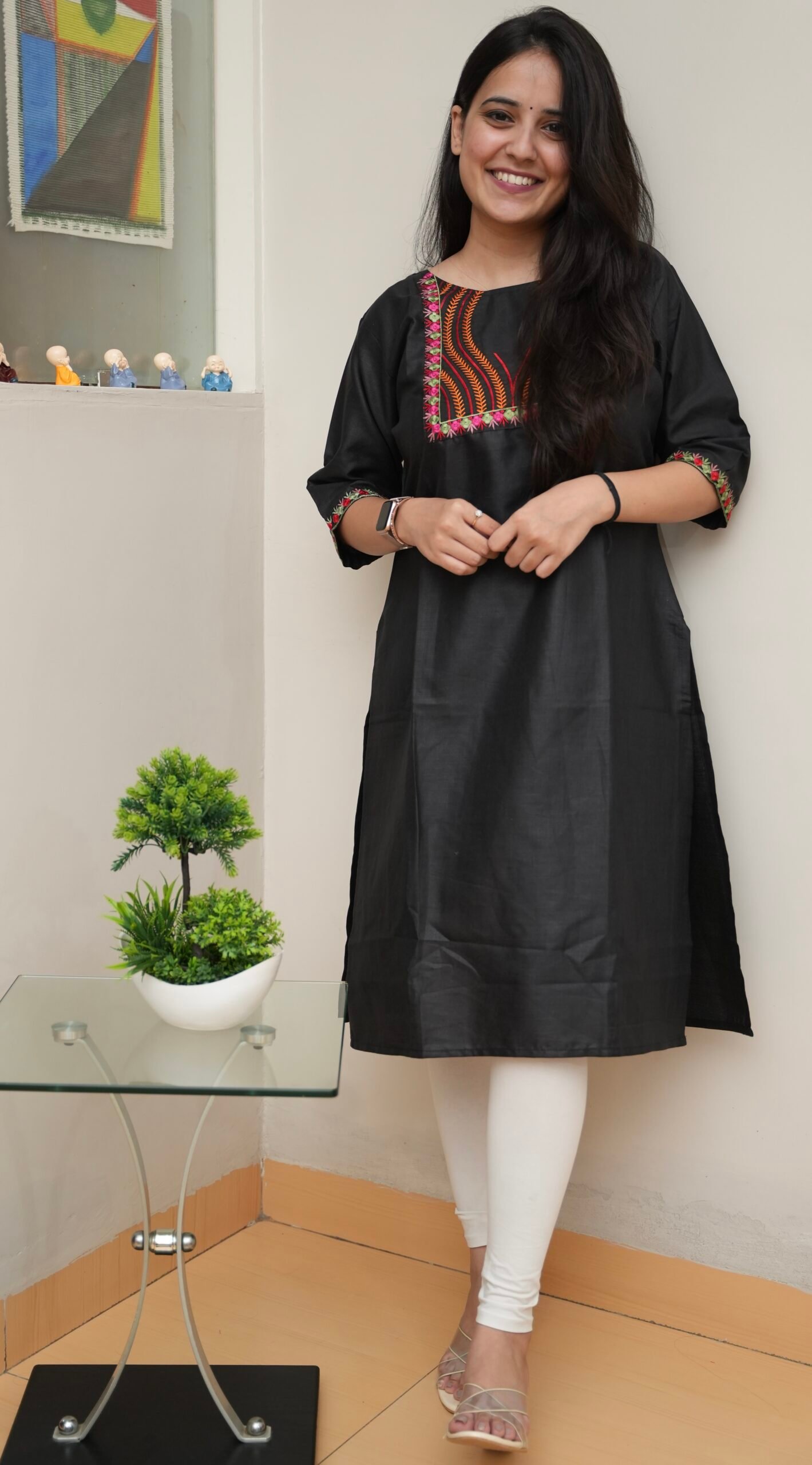 A timeless black kurta elevated with vibrant thread embroidery on the yoke and sleeves. Crafted in a smooth, comfortable fabric with a straight silhouette, this piece effortlessly blends simplicity with a splash of colorful tradition—perfect for workwear or casual festive outings.