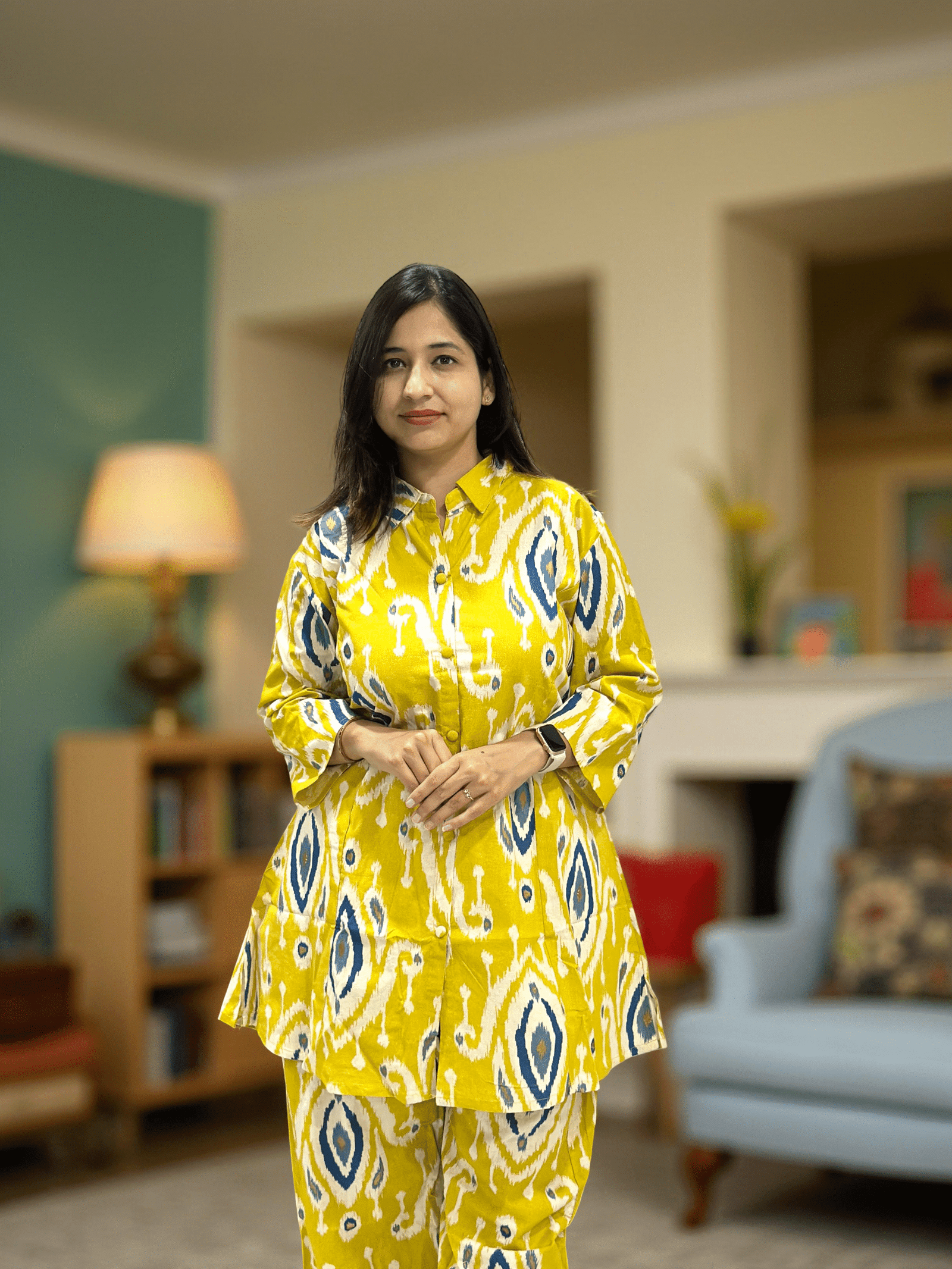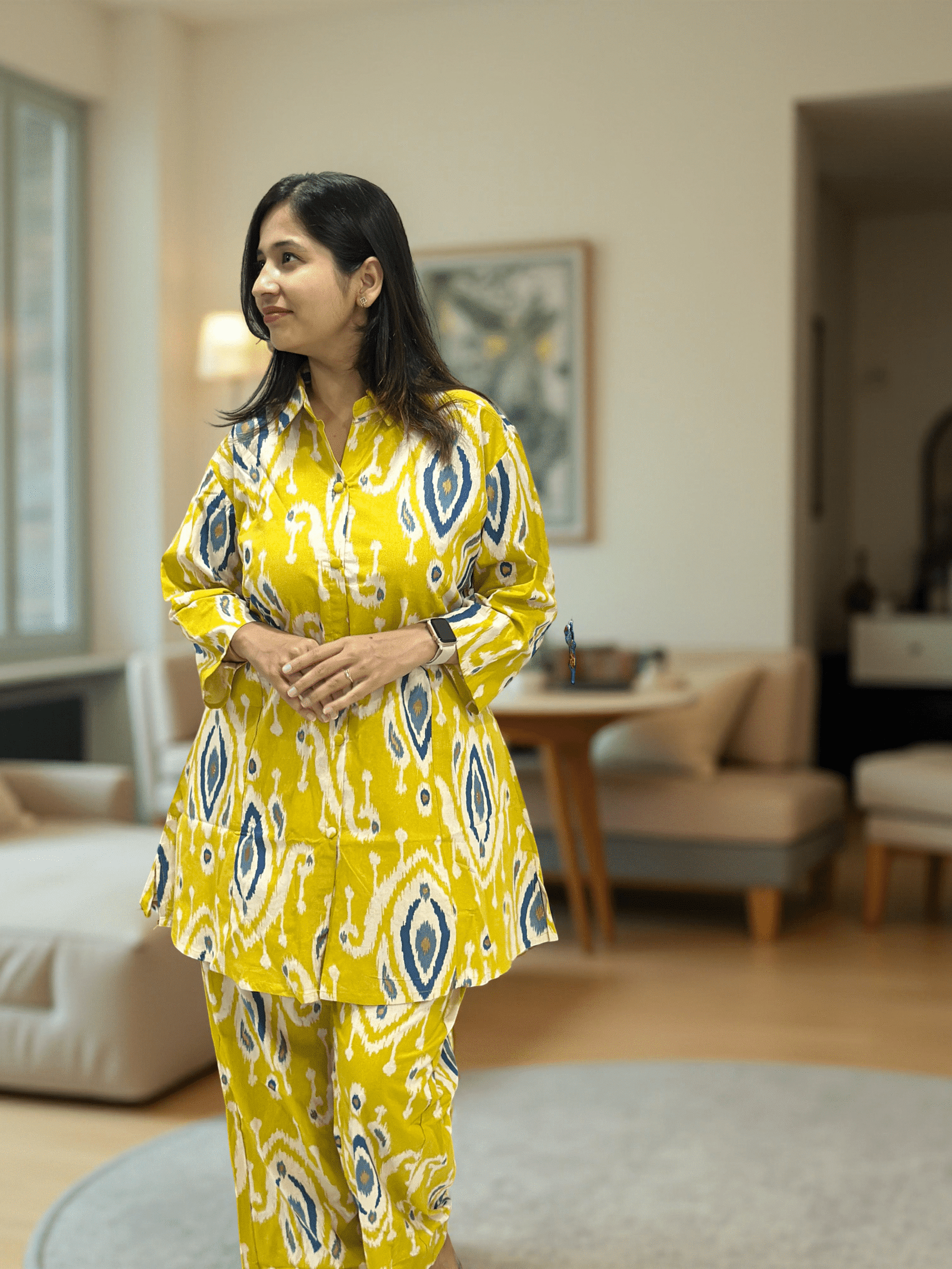 This Yellow Ikat Printed Kurta-Pant Co-ord Set is a perfect blend of comfort and style. Designed in premium cotton fabric, it features a vibrant ikat pattern that adds a traditional yet contemporary charm. The relaxed silhouette ensures ease of movement, making it suitable for both casual outings and semi-formal occasions. Pair it with minimal accessories to complete the elegant look.