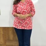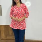 This vibrant red top features an all-over floral print in white and black, paired with a flattering V-neckline and 3/4th sleeves. Crafted from breathable cotton, it’s perfect for adding a pop of color and comfort to your daily wear.