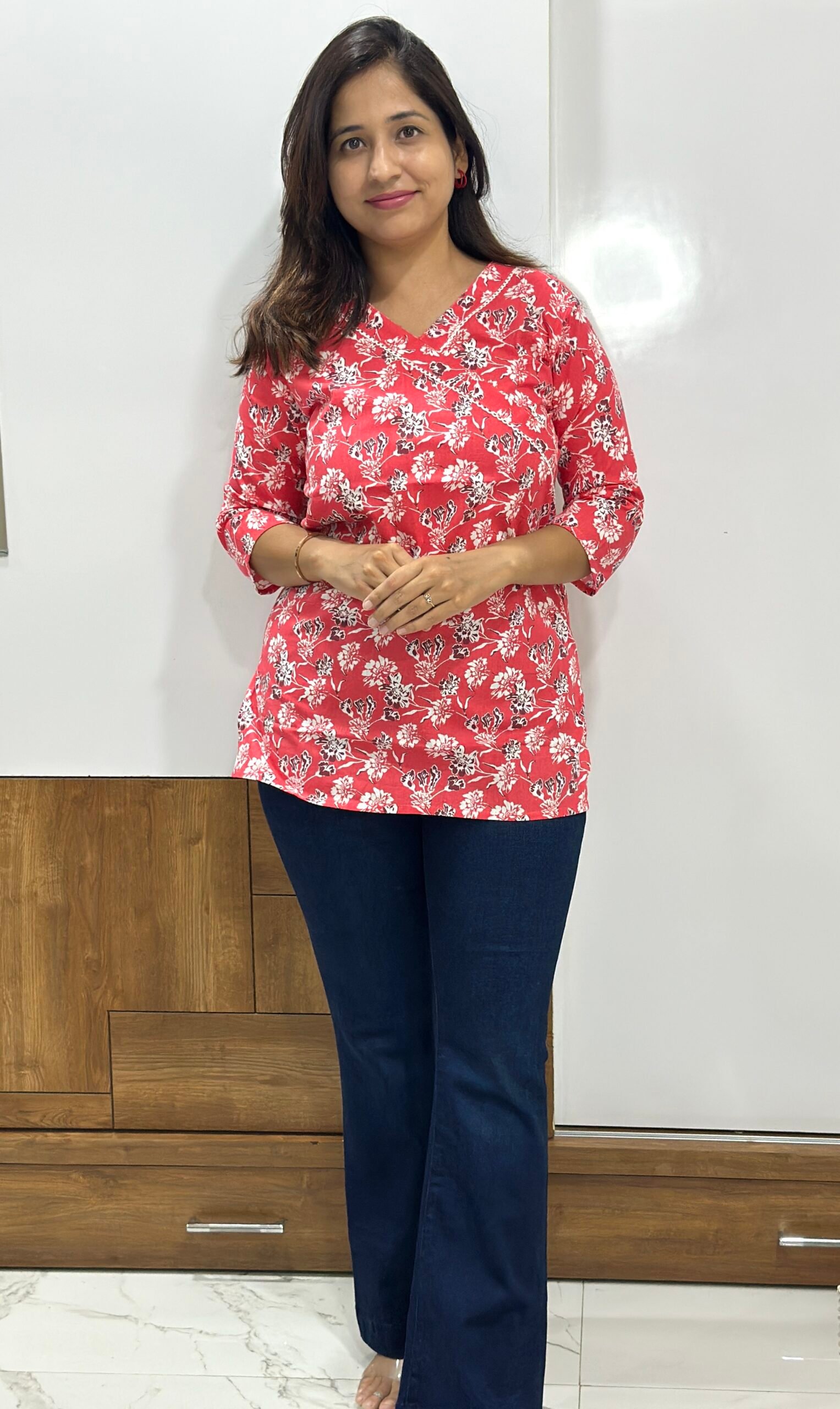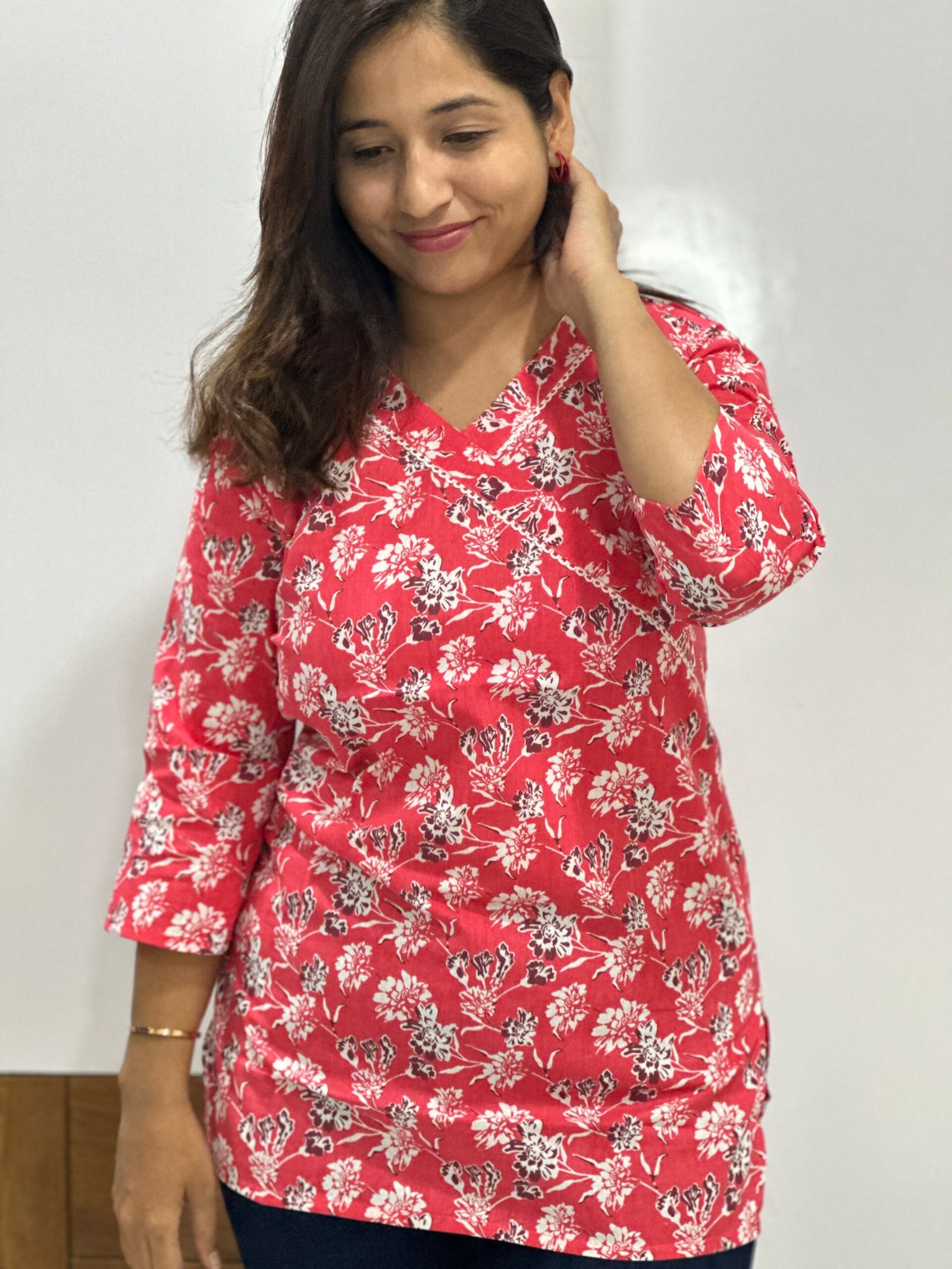 This vibrant red top features an all-over floral print in white and black, paired with a flattering V-neckline and 3/4th sleeves. Crafted from breathable cotton, it’s perfect for adding a pop of color and comfort to your daily wear.