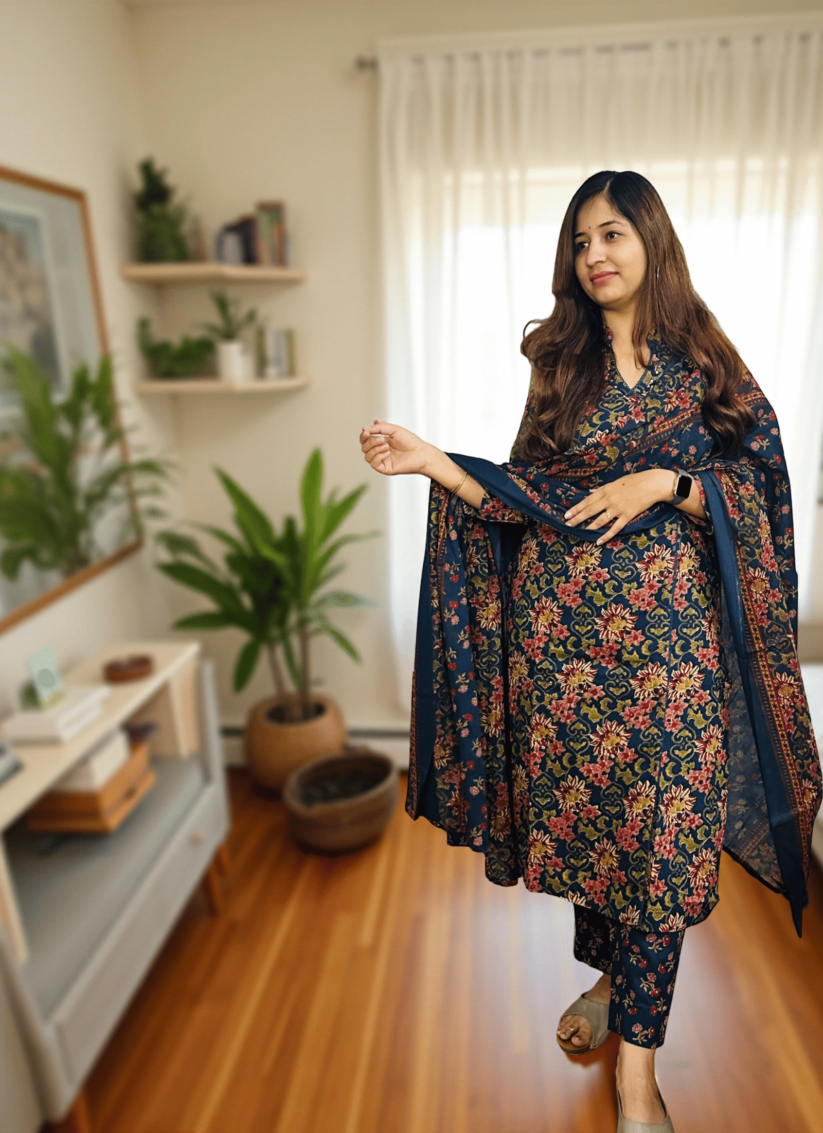 This floral printed suit set, featuring intricate blooms in warm hues with angrakha detailing on the neck. Crafted from soft, breathable fabric, it pairs beautifully with matching pants and a detailed dupatta, offering a perfect blend of comfort and traditional charm. Ideal for festive gatherings, office wear, or cozy evening get-togethers.