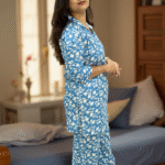 Crafted from breathable fabric, this set features a straight-fit kurta and matching pants adorned with delicate white floral prints. Whether you’re lounging at home or stepping out for casual errands, this outfit offers the perfect blend of comfort and charm.