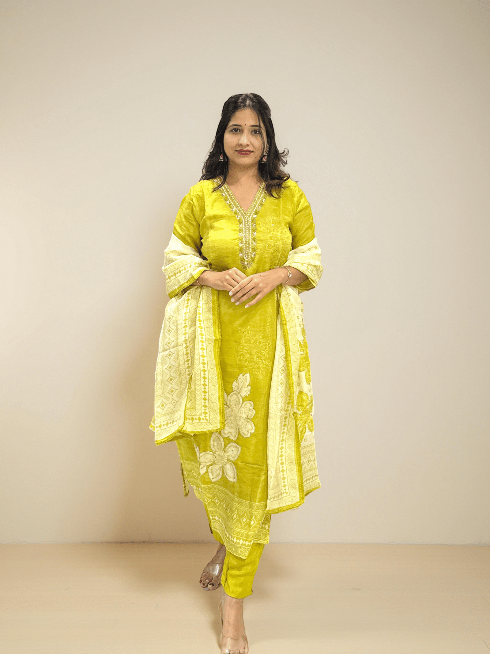 Adorned with delicate hand embroidery, this suit set blends tradition and elegance in every stitch.