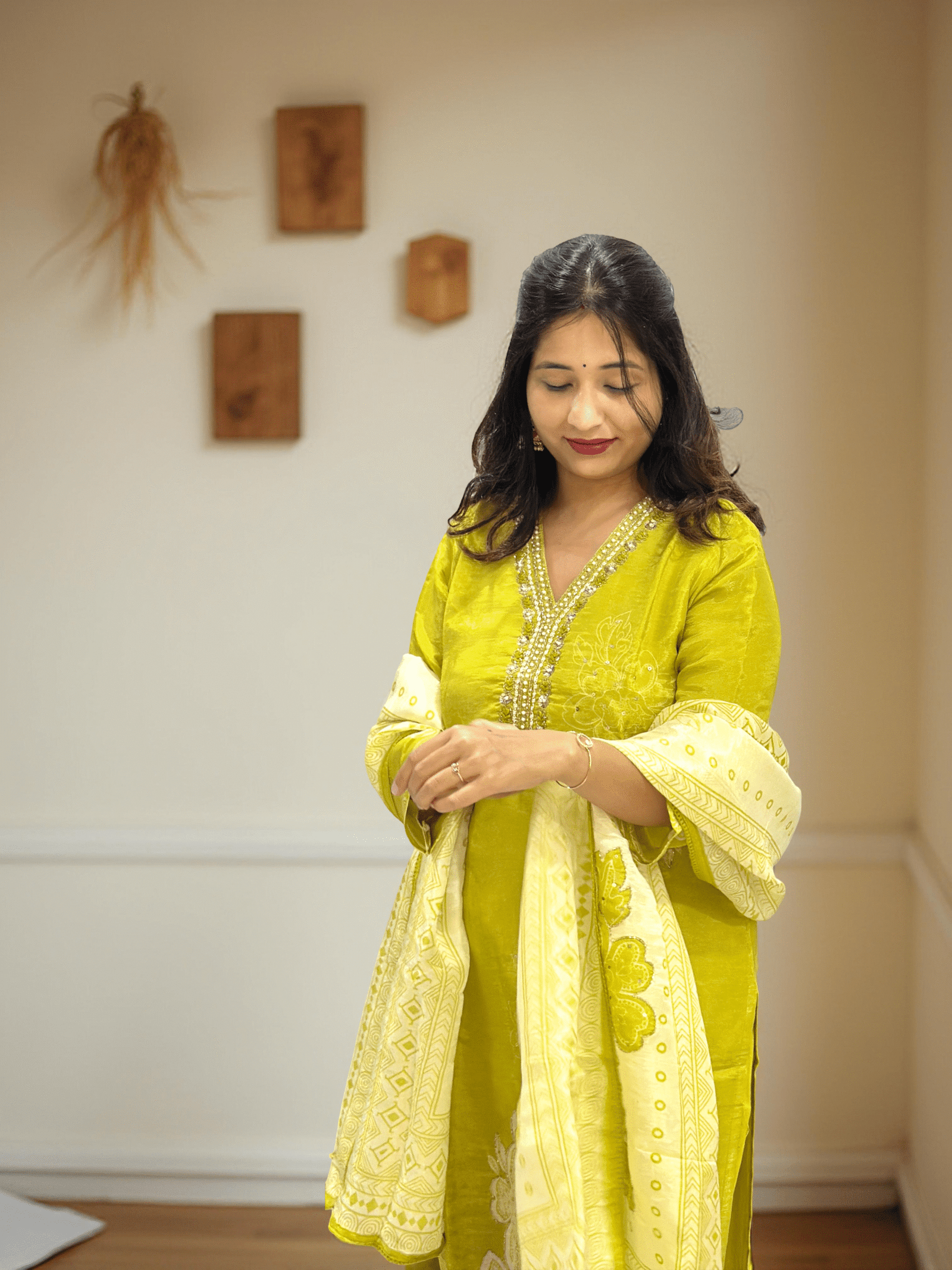 Step into the spotlight with this stunning sunshine mustard yellow kurta set, crafted to elevate your ethnic wardrobe. Featuring intricate embroidery, bold floral detailing, and a beautifully paired dupatta – this outfit is perfect for haldi ceremonies, poojas, or simply when you want to glow with grace. 🌼