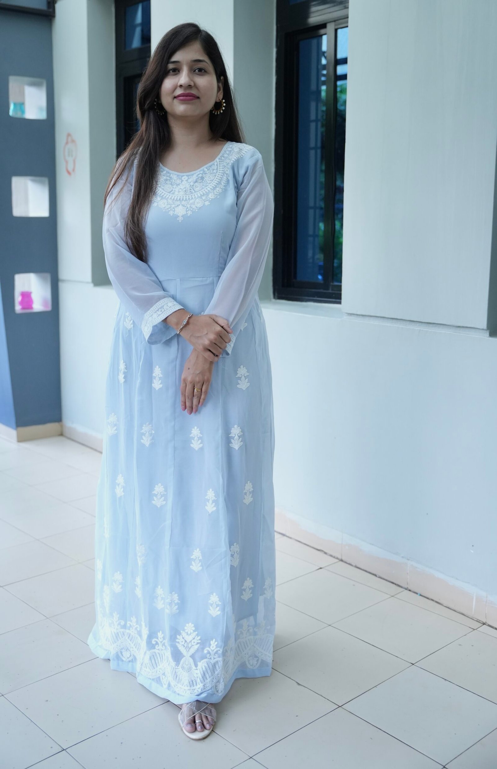 ✔ Highlight: Its delicate Chikankari-inspired white thread embroidery, adding timeless elegance to its graceful, flowing silhouette.
