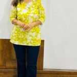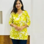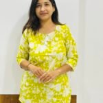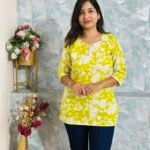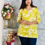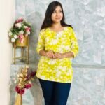 This cheerful yellow short kurti is adorned with delicate white floral prints, radiating a fresh and sunny vibe. Made from soft, breathable cotton, it features 3/4th sleeves and a tie-up neckline with tassel detailing, offering both comfort and charm—perfect for casual outings or a bright workday look.